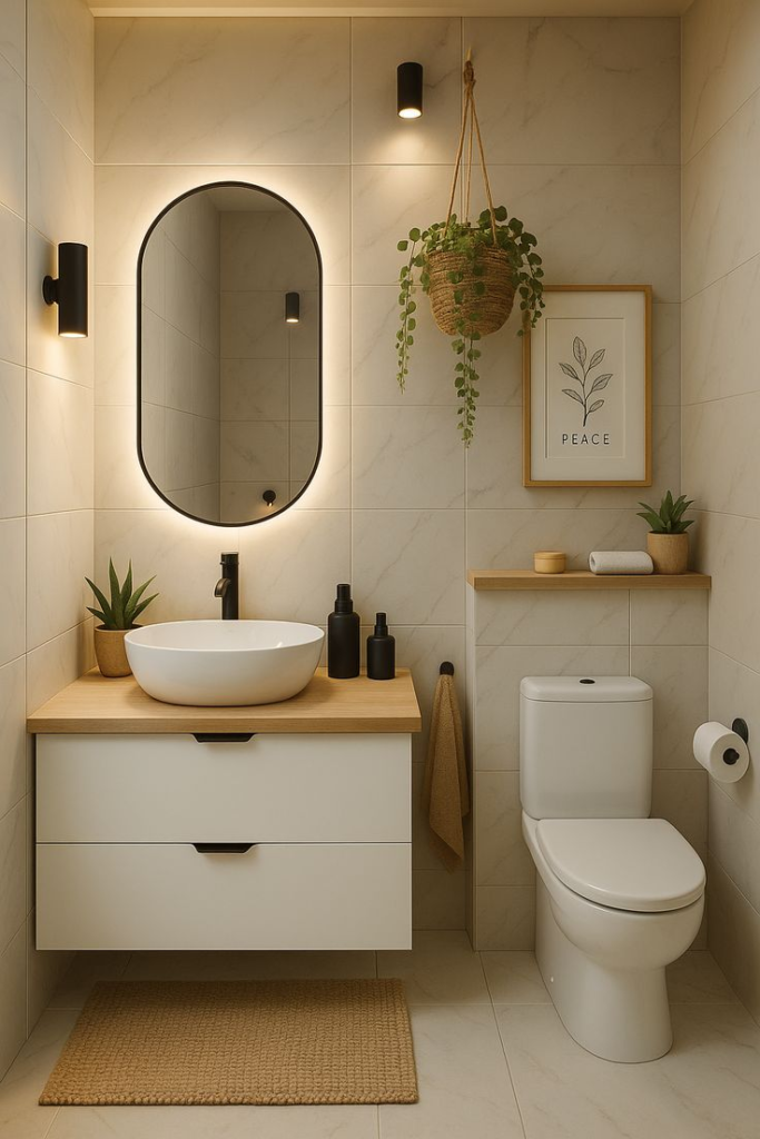 Incorporate small potted plants, bamboo accessories, or natural stone elements to soften the space and add organic warmth. Greenery purifies air and creates a spa-like atmosphere, proving that even the smallest bathroom can feel like a peaceful sanctuary.