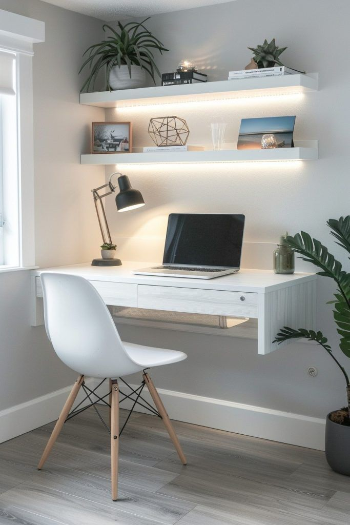 A floating desk attached directly to the wall eliminates bulky legs and creates an airy, open feel beneath your work surface.